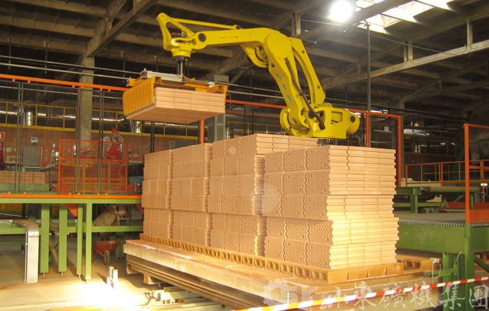 机器人自动码坯系统主要适用于新型建筑材料厂砖坯的切割、运输、码放、卸垛及受场地限制的老砖厂实现自动化码坯生产线的改造,码坯机器人具有投资小、耗能少、稳定性高、运转灵活,占地空间小等特点,与窑型及多功能编组的配套灵活,可满足不同产量下码坯及卸砖需求。该系统采用的机器人运动灵活、准确度高、承载力大,其高灵敏度碰撞检测功能,可以瞬时检测出碰撞并紧急停机,可有效防止因碰撞引起的对机械手和物品的损害。