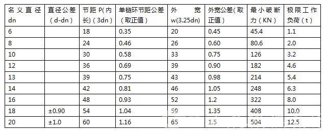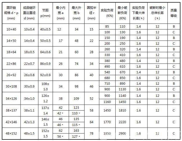 主要产品有矿用高强度圆环链、起重链、捆绑链和防护链。 矿用高强度圆环链用于刮板输送机、转载机和采煤机的传动链。 起重链、捆绑链和防护链用于水泥、船舶、航道、码头、运输等领域;另外还按照美国、英国、德国、日本等国际标准生产多规格链条,并出口多个国家。 矿用高强度链条技术参数: 注:*表示扁平环尺寸 起重用短环链